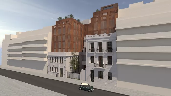 Σύμφωνα με την άδεια που έχει λάβει η εισηγμένη Επενδυτική Ακινήτων, η συνολική δόμηση των σχεδόν 4.800 τ.μ. καταμερίζεται επί της οδού Δημητρακοπούλου σε τέσσερις ορόφους εντός του περιβλήματος της νεοκλασικής όψης και δύο ορόφους πάνω από αυτήν, ενώ επί της οδού Φαλήρου σε τέσσερις ορόφους εντός του περιβλήματος της νεοκλασικής όψης και τρεις ορόφους πάνω από αυτήν.