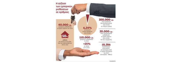 Αντίστοιχα, στον τομέα των εμπορικών καταστημάτων, με βάση τα στοιχεία της Proprius, στις δημοφιλέστερες εμπορικές «πιάτσες», κατά το πρώτο τρίμηνο του 2023 παρατηρήθηκε αύξηση των νέων μισθώσεων κατά 40% σε σχέση με το τέταρτο τρίμηνο του 2022. Είναι χαρακτηριστικό ότι καταγράφηκαν πάνω από 60 νέες συμφωνίες κατά τους πρώτους τρεις μήνες του έτους, εκ των οποίων οι 40 αφορούσαν ακίνητα στην Αττική, με συνολική επιφάνεια 20.000 τ.μ.