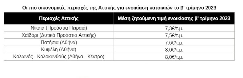 Λίγο υψηλοτέρα διαμορφώνονται οι τιμές σε Χαϊδάρι (7,5 ευρώ ανά τ.μ) και τα Πατήσια (7,6 ευρώ ανά τ.μ). Στα 8 ευρώ ανά τ.μ διαμορφώνεται η μέση τιμή ενοικίου σε Κυψέλη και Κολωνό.